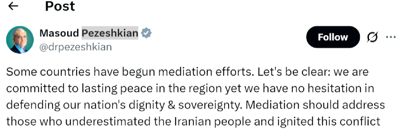 佩澤希齊揚同時在社交媒體發(fā)文稱,一些國家已開始調解沖突,但調解應當“針對那些低估伊朗人民并點燃這場沖突”的人。伊方致力于地區(qū)持久和平,但在捍衛(wèi)國家尊嚴與主權問題上,伊方毫不猶豫。