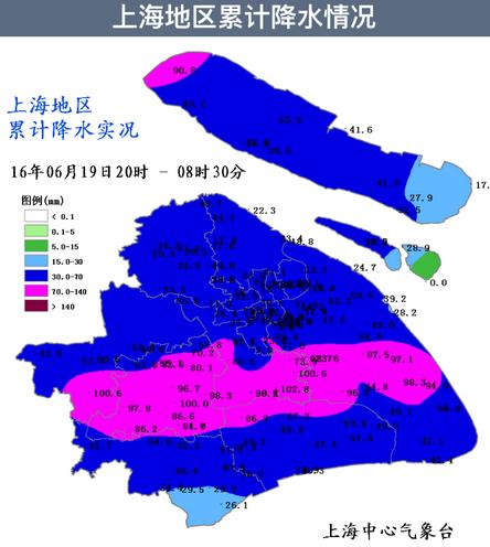 受梅雨帶影響,昨天夜間到今天本市出現(xiàn)大雨和暴雨,松江、閔行南部、浦東一些地方出現(xiàn)暴雨和大暴雨(下圖玫紅色部分)。