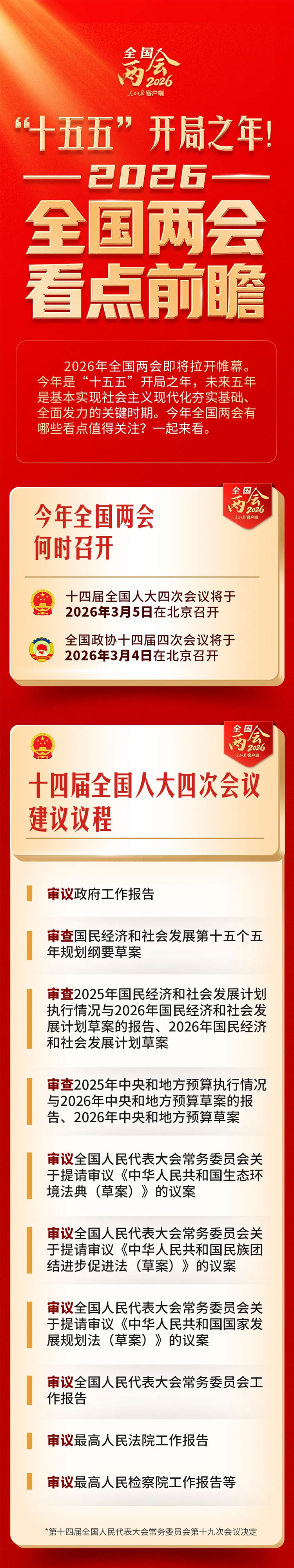 十四屆全國人大四次會議和全國政協(xié)十四屆四次會議,將分別于2026年3月5日和4日在北京開幕。2026年是“十五五”開局之年,今年全國兩會有哪些看點值得關(guān)注?隨小舟一起來看→