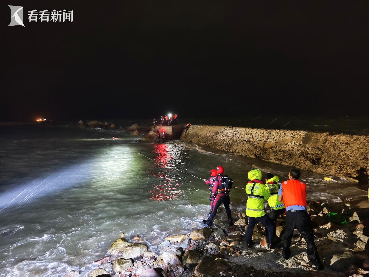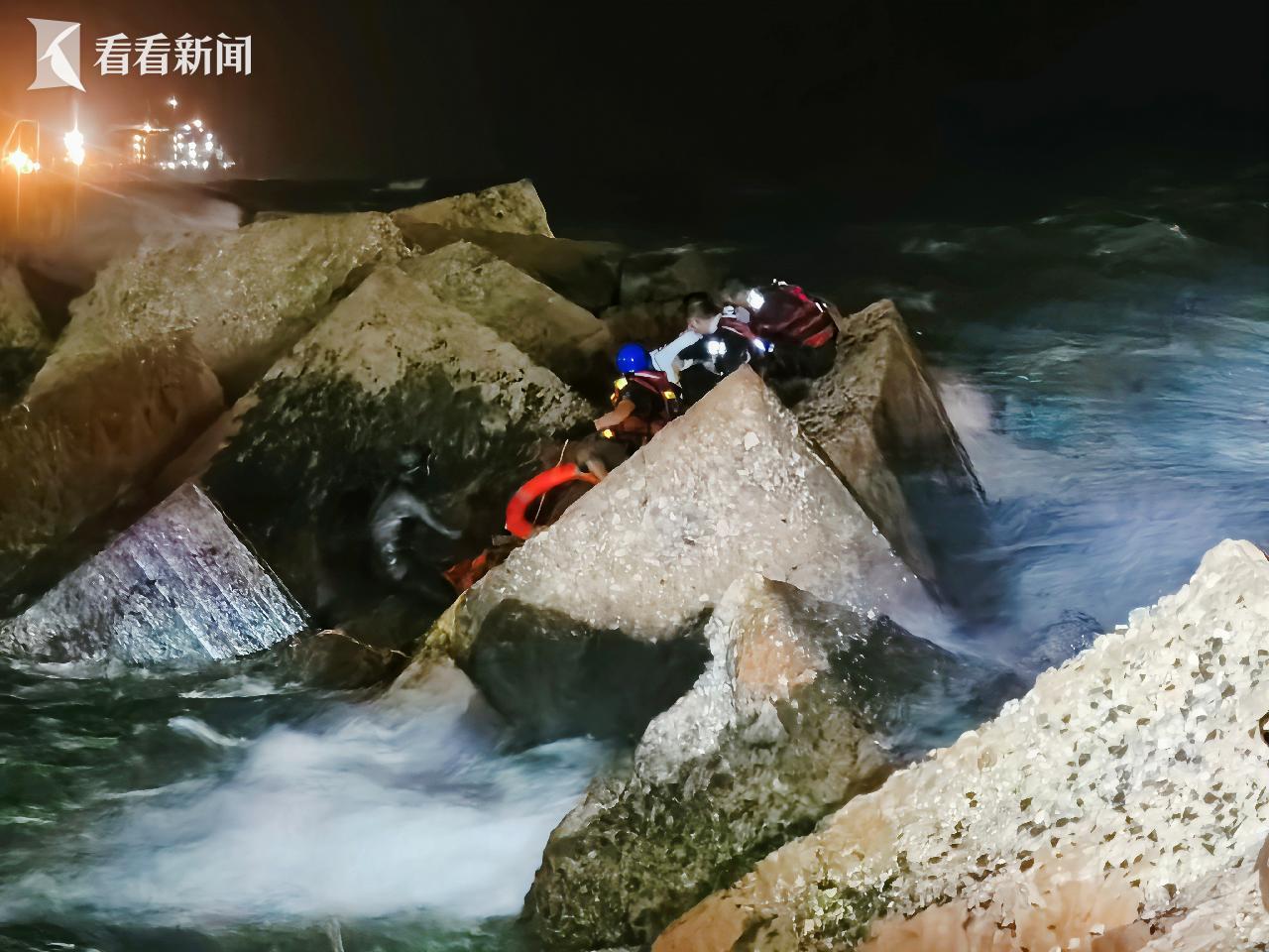 19時18分接警后,東方消防指揮中心立即調(diào)派2車12人攜橡皮艇趕赴現(xiàn)場。消防救援力量抵達時,公安、海警已先期到場,一名公安人員曾只身攜帶繩索嘗試救援,卻因無防護裝備、現(xiàn)場風浪肆虐,未能成功。19時55分,海藍救援隊抵達增援。現(xiàn)場緊急研判后,決定由水性好的海藍救援隊隊員,攜帶救生繩、救生圈和浮力背心,頂浪游向礁石。岸上其余救援人員緊握繩索嚴陣以待。救援人員攀上礁石后,為被困者穿戴好防護裝備,固定好安全繩,岸邊人員立即合力拉繩。